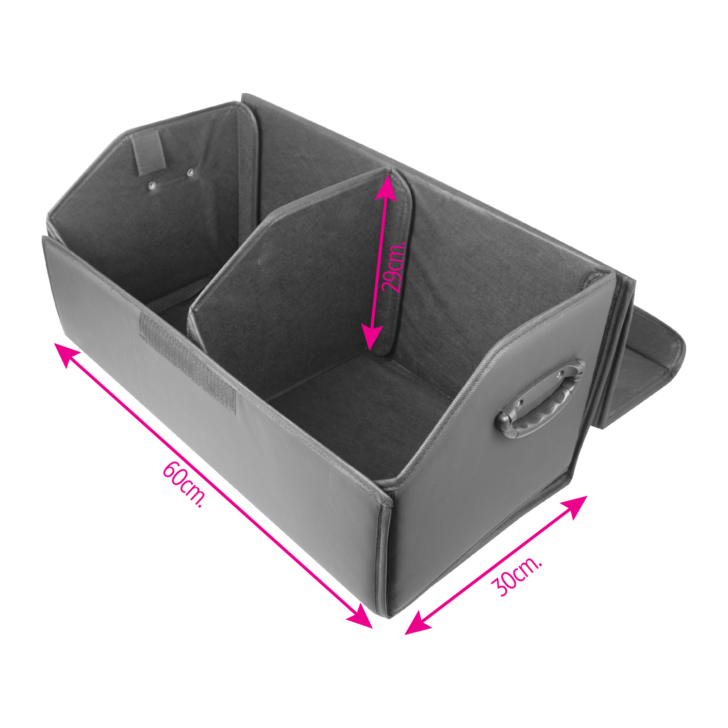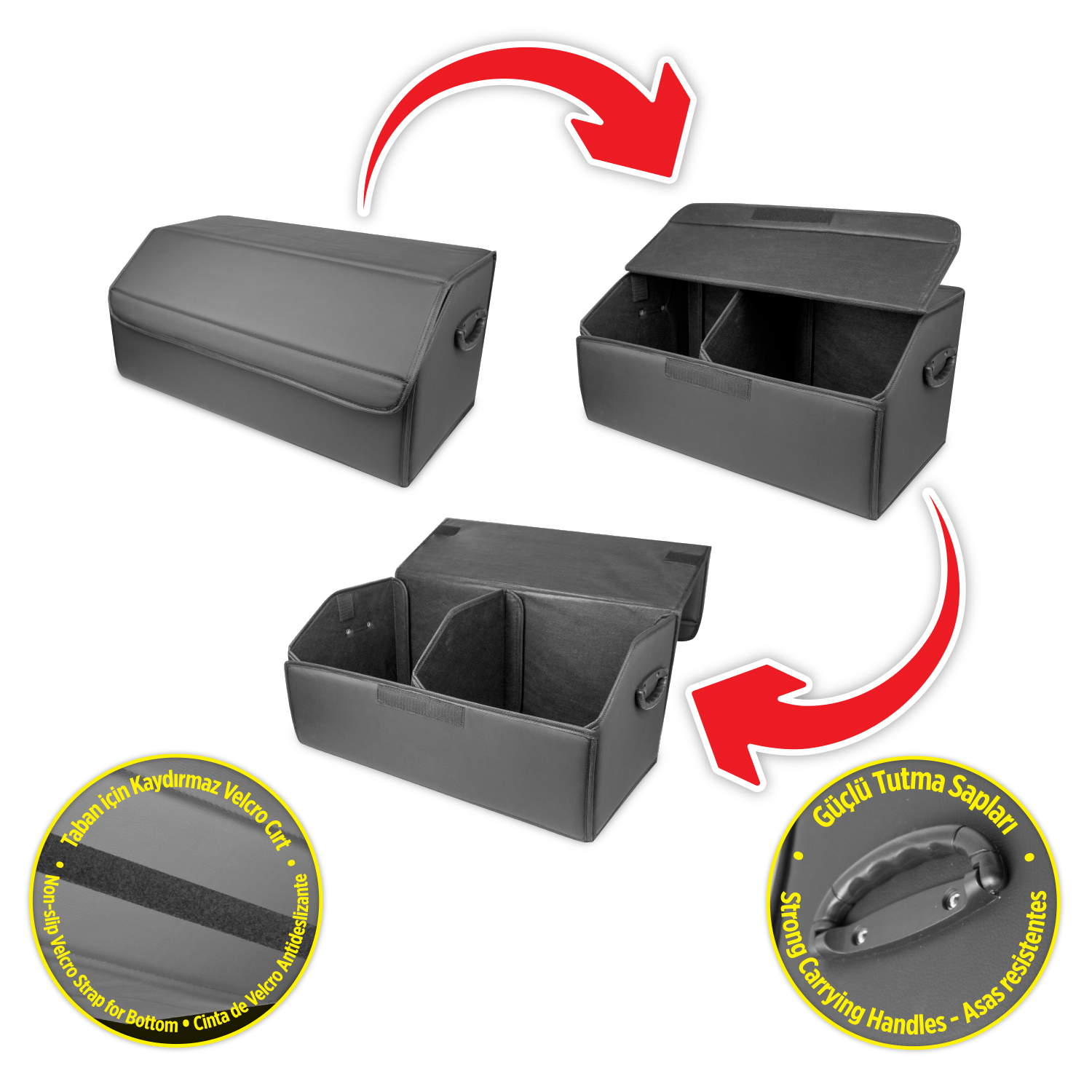 Geniş iç hacmi ve iki bölmeli yapısı sayesinde araç bakım ürünleri, alışveriş poşetleri, acil durum ekipmanları ve kisisel eşyalarınizı kolayca yerleştirmenizi sağlar.