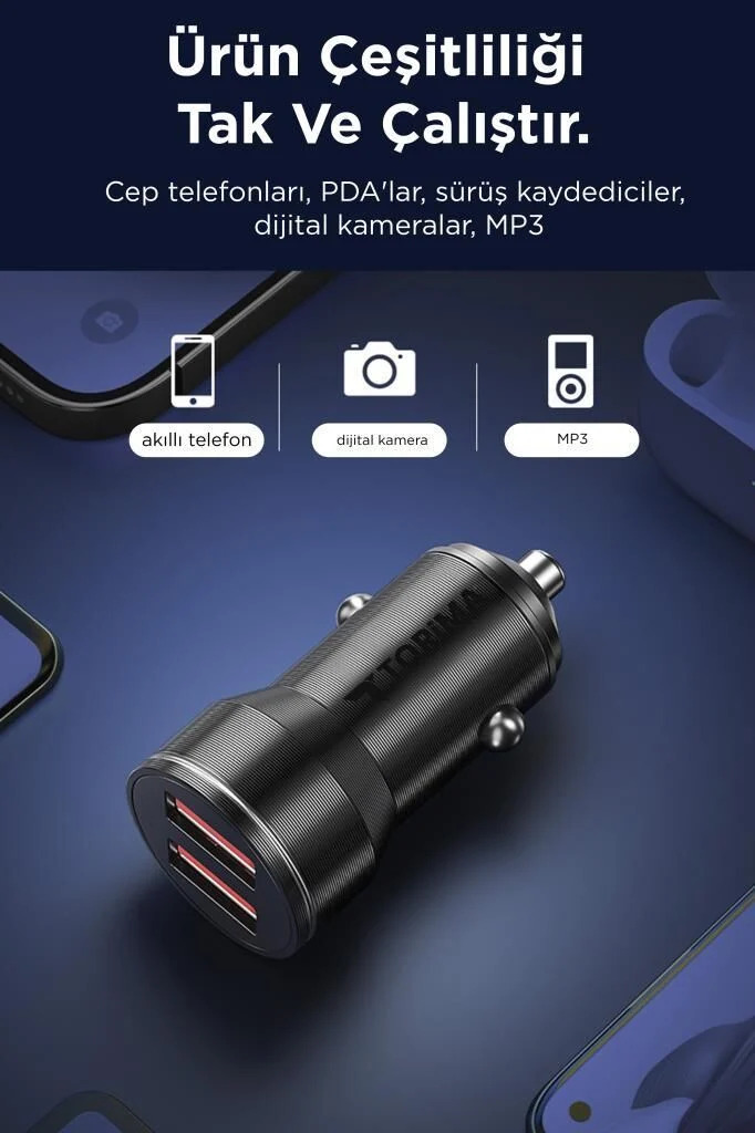 Torima C01 Siyah 2 USB Portlu Araç Şarj Cihazı, USB şarj kablosu ile şarj edilebilen tüm cihazlarla uyumludur. Telefonlar, tabletler, kameralar, oyun konsolları ve daha fazlası için kullanılabilir.